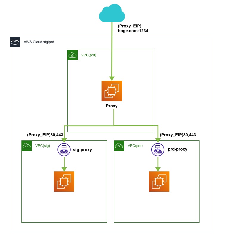- 接続先には各環境のALBに対してProxyのEIPと80,443を許可する前提