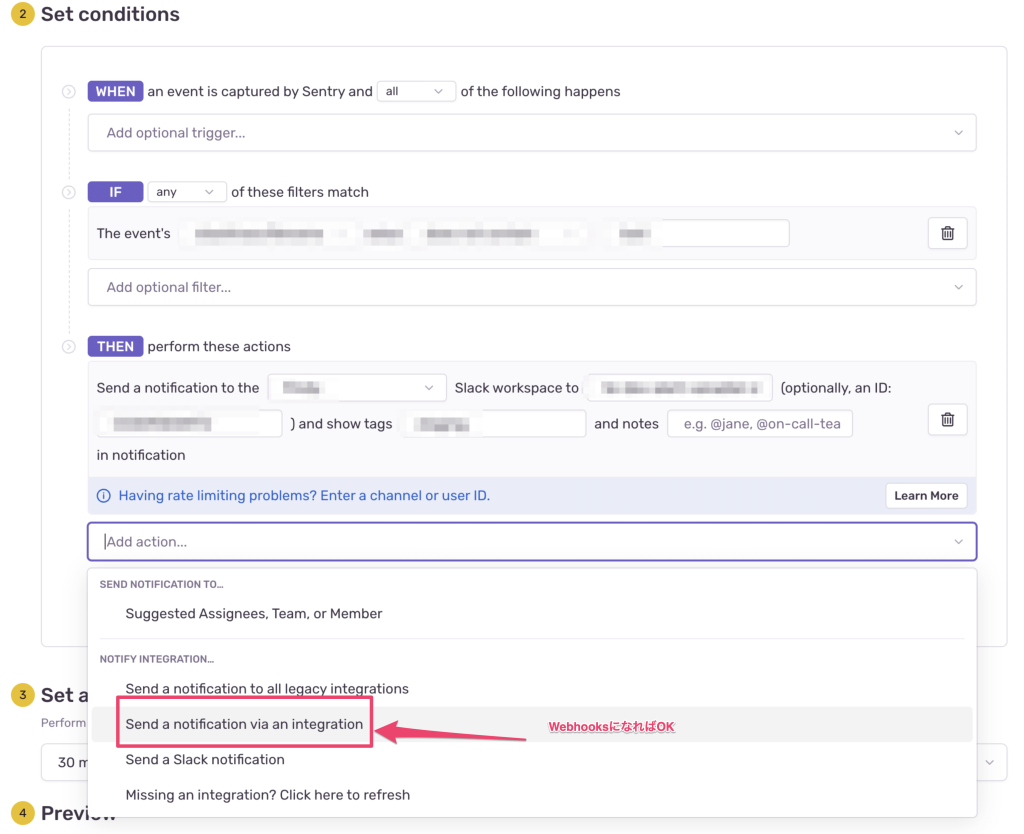 - Sentry > Alerts > Set conditions > Send a notification via an integration
