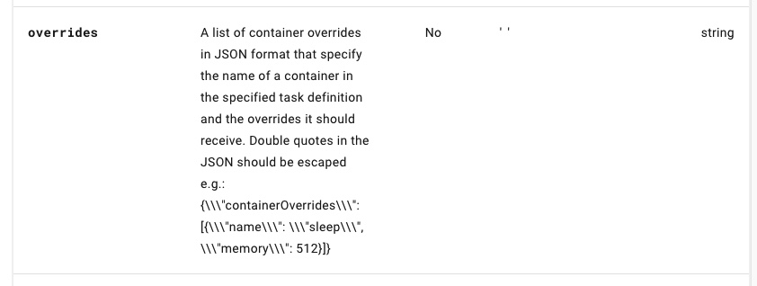 overrides: "{\"containerOverrides\":[{\"name\": \"app\", \"command\": [\"sh\", \"ls\"]}]}" |
